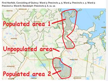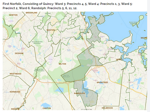 Regarding the 1st Norfolk district (Rep. Ayers), the existing district is an example of racial gerrymandering which results in the disempowerment of four precincts of Randolph. The Supreme Court's recent rulings on gerrymandering distinguish that partisan gerrymandering is allowed, but racial gerrymandering is disallowed – so I focus on the racial gerrymandering aspects. In the 1st Norfolk district, one-third of Randolph is electorally disempowered by pairing us with a wealthy white section of Quincy, with whom the people of Randolph have little economic interaction nor demographic similarity, based on a misleading geographical closeness.
